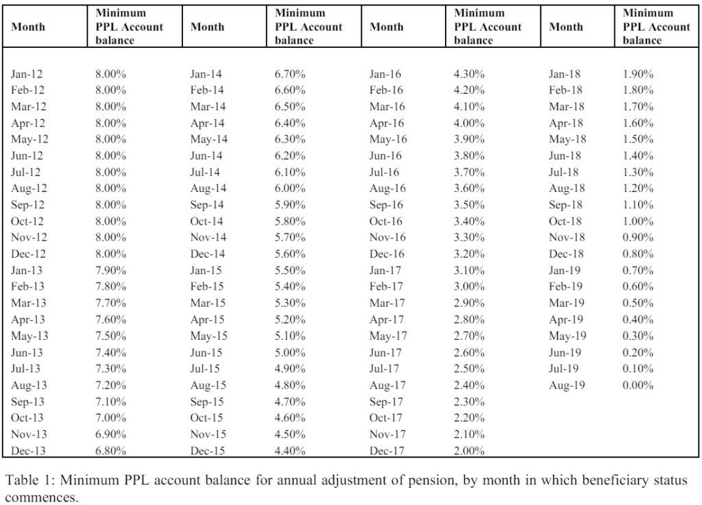 a) Persons who become beneficiary of a pension between 1 January 2012 and 31 July 2019, inclusive, shall receive no annual adjustment of pension unless their PPL account maintains no less than the minimum balance set out in Table 1. Provided their PPL account has such a balance, the method set out in paragraphs 2 (b) and (c) shall apply.