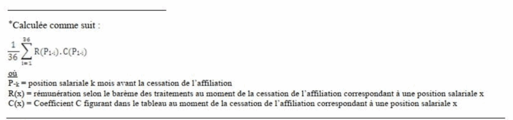 i) la moyenne* des traitements de référence des 36 derniers mois, correspondant chacun à la rémunération pour 40 heures de travail par semaine, obtenue à partir du barème des traitements en vigueur au moment de la cessation de l’affiliation ;